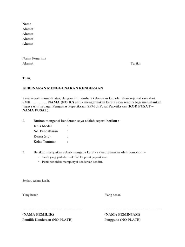 Surat kebenaran menggunakan kenderaan sendiri. Untuk makluman pihak tuan nombor pendaftaran. Kenderaan kuasa enjin kelas perbatuan. Surat kebenaran menggunakan kenderaan 1.