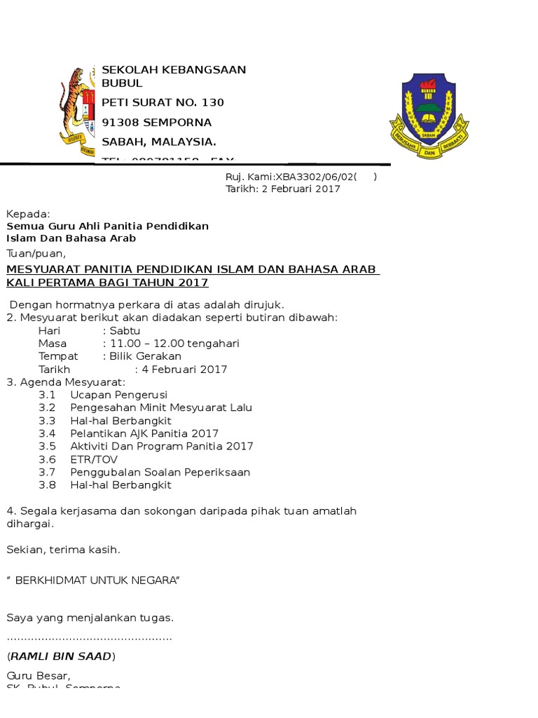 Doc Surat Panggilan Mesyuarat Panitia Bm Terkini Saripah Din Academia Edu