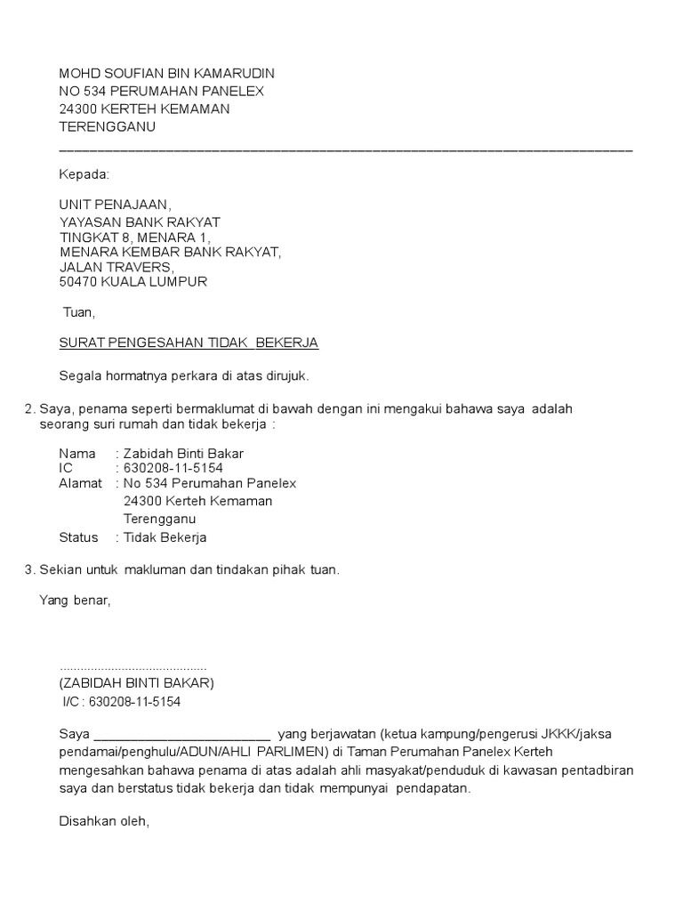 Surat Rasmi Ibu Tidak Bekerja Surat Rasmi D