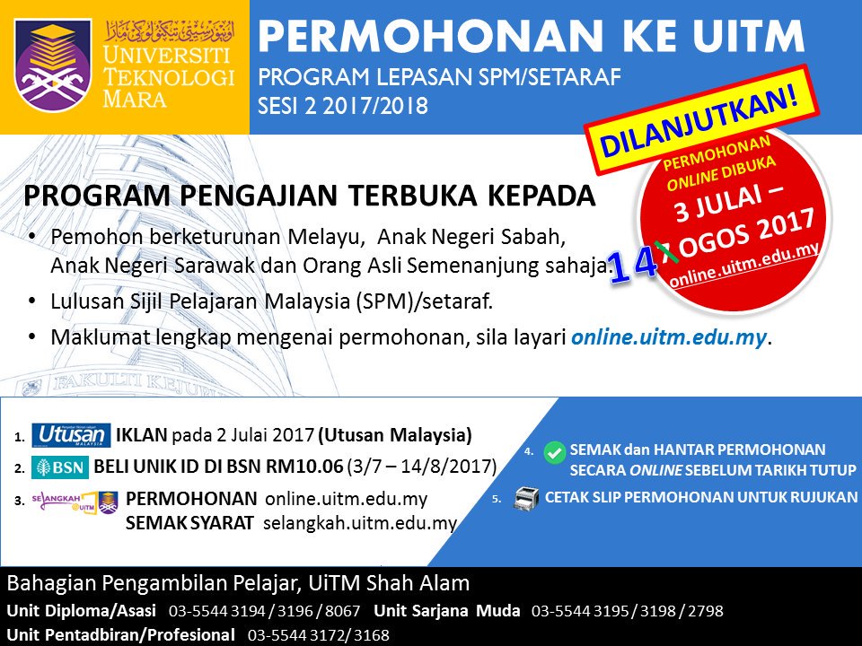 Uitm Official On Twitter Tarikh Tutup Permohonan Kemasukan Ke Uitm Program Lepasan Spm Setaraf Sesi 2 2017 2018 Ke 14 Ogos 2017 Jommasukuitm Uitmdihatiku Https T Co Oegj5mb6qd