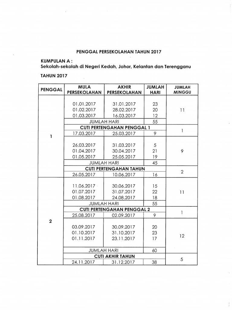 Takwim Kalendar Cuti Penggal Sekolah 2017