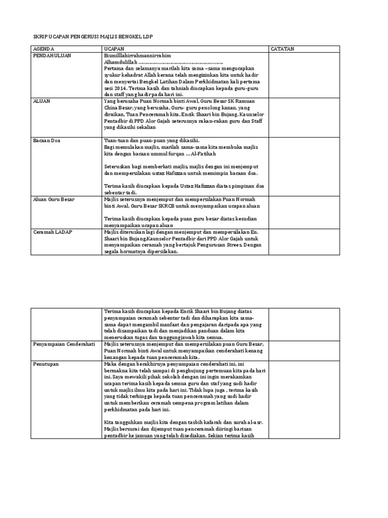 Contoh Skrip Ucapan Pengerusi Majlis Bengkel Ldp