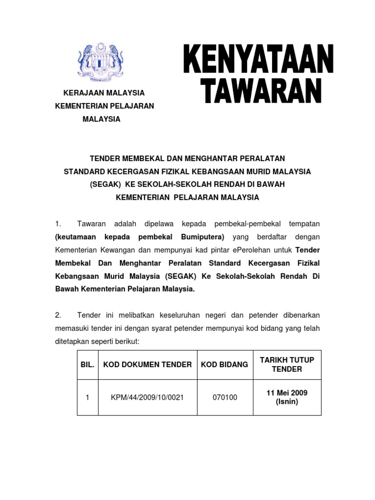 1 Kerajaan Malaysia Kementerian Pelajaran Malaysia Tender