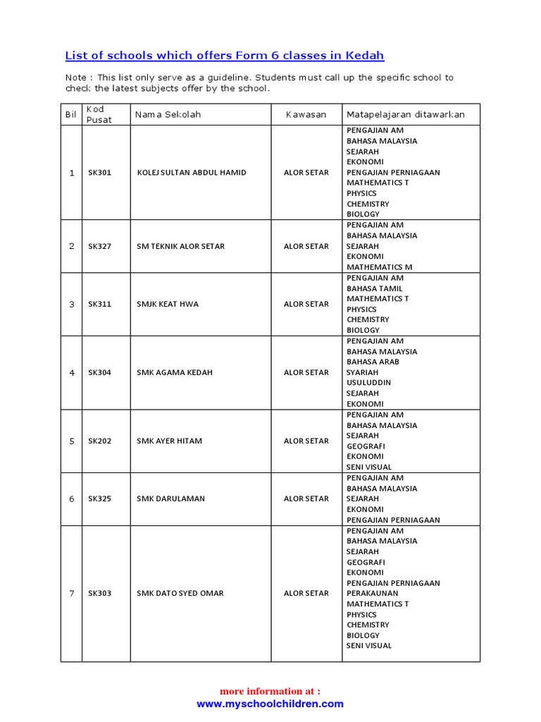 List Of Schools Which Offers Form 6 Classes In Kedah More Information At