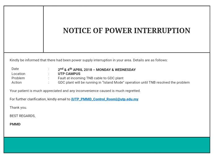 Student Representative Council On Twitter Notice Of Power Interruption Dear Utp Community Property Management Maintenance Department Pmmd Had Released A Notice To All Utp Emails On The Problem Action For